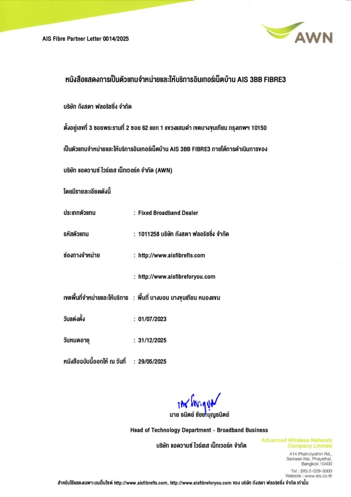 เรา aisfibreforyou.com เป็นตัวแทนจำหน่ายอินเทอร์เน็ตบ้าน AIS Fibre อย่างเป็นทางการ ภายใต้การดำเนินงานของ บริษัท กังสดา ฟลอริซซิ่ง จำกัด ให้บริการอินเทอร์เน็ตความเร็วสูงผ่านโครงข่ายไฟเบอร์ออปติกสมัยใหม่ของ AIS ที่ได้รับการยอมรับด้านความเสถียรและประสิทธิภาพ ทีมงานมืออาชีพของเราพร้อมให้คำปรึกษาและช่วยคุณเลือกแพ็กเกจที่เหมาะสม ตอบโจทย์ทั้งการทำงาน การเรียน และความบันเทิงออนไลน์ หากคุณกำลังมองหาการเชื่อมต่อที่รวดเร็ว มั่นคง และไว้วางใจได้ aisfibreforyou.com คือคำตอบสำหรับคุณ