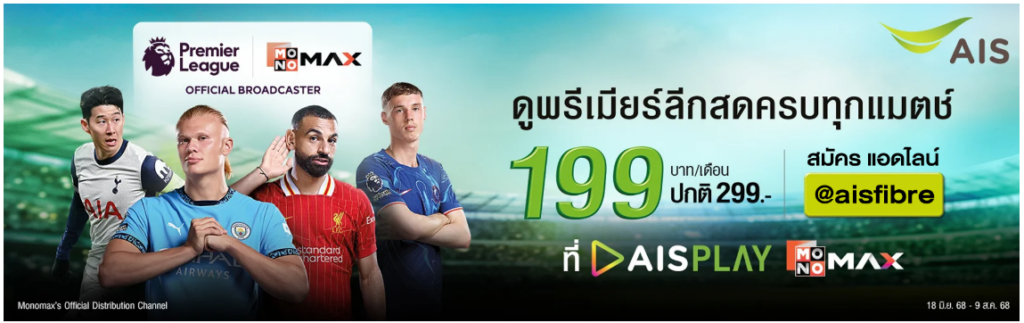 สิ้นสุดการรอคอยสำหรับคอบอลชาวไทย! ฤดูกาลใหม่ที่กำลังจะมาถึงกับ พรีเมียร์ลีก 2025/2026 (Premier League) ที่ประกาศเปิดฤดูกาลอย่างเป็นทางการในวันเสาร์ที่ 16 สิงหาคม 2568 สำหรับลูกค้า AIS Fibre และ AIS Mobile เตรียมตัวรับความคุ้มค่าครั้งใหม่ กับแพ็กเกจ PLAY MONOMAX Standard ที่มัดรวมทั้งฟุตบอลลีกดังและหนังซีรีส์ระดับโลกไว้ในที่เดียว